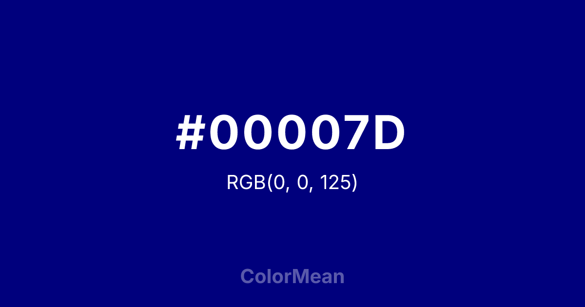 #00007D RGB value is (0, 0, 125). The hex color red value is 0, green is 0, and blue is 125. Its HSL format shows a hue of 240°, saturation of 100 percent, and lightness of 25 percent. The CMYK process values are 100 percent, 100 percent, 0 percent, 51 percent.