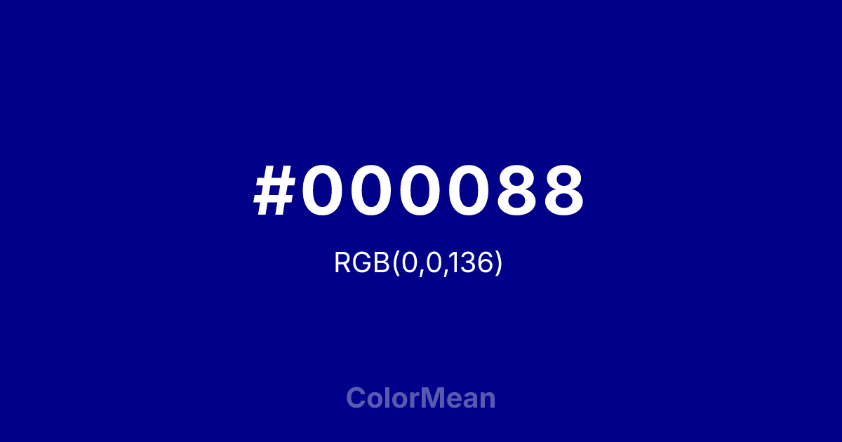 #000088 RGB value is (0, 0, 136). The hex color red value is 0, green is 0, and blue is 136. Its HSL format shows a hue of 240°, saturation of 100 percent, and lightness of 27 percent. The CMYK process values are 100 percent, 100 percent, 0 percent, 47 percent.