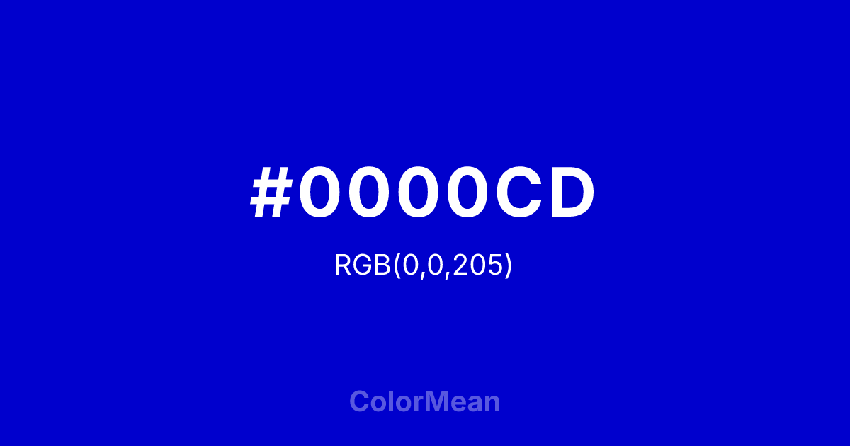 Medium Blue (#0000CD) RGB value is (0, 0, 205). The hex color red value is 0, green is 0, and blue is 205. Its HSL format shows a hue of 240°, saturation of 100 percent, and lightness of40 percent. The CMYK process values are 100 percent, 100 percent, 0 percent, 20percent.