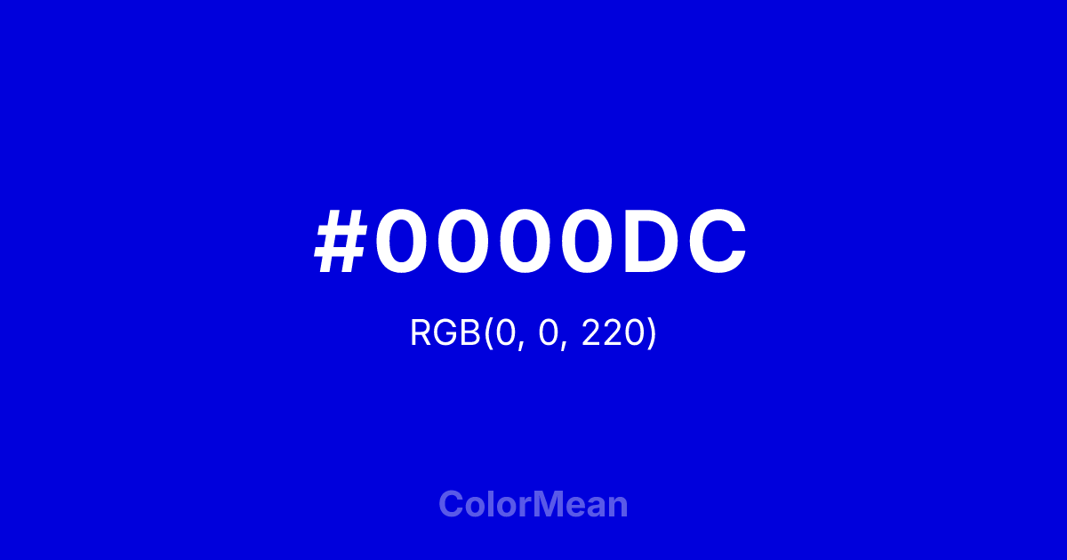 #0000DC RGB value is (0, 0, 220). The hex color red value is 0, green is 0, and blue is 220. Its HSL format shows a hue of 240°, saturation of 100 percent, and lightness of 43 percent. The CMYK process values are 100 percent, 100 percent, 0 percent, 14 percent.
