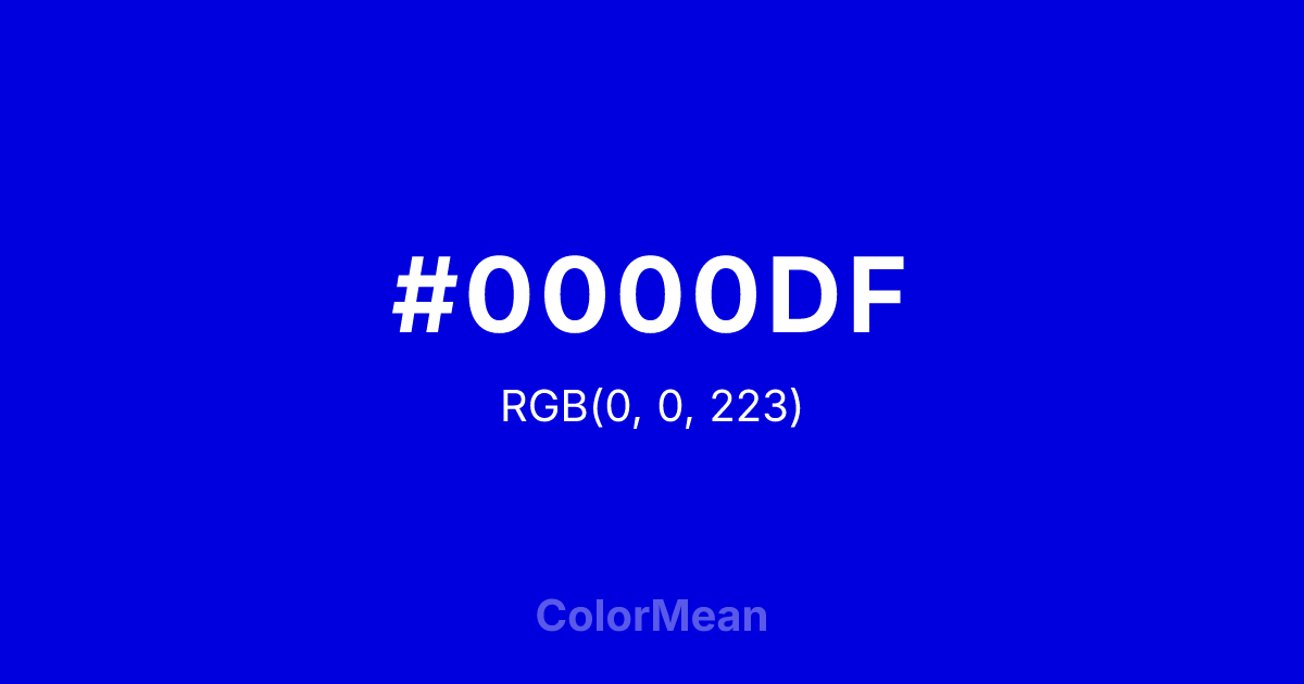 #0000DF RGB value is (0, 0, 223). The hex color red value is 0, green is 0, and blue is 223. Its HSL format shows a hue of 240°, saturation of 100 percent, and lightness of 44 percent. The CMYK process values are 100 percent, 100 percent, 0 percent, 13 percent.