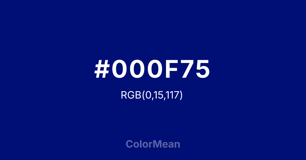 #000F75 RGB value is (0, 15, 117). The hex color red value is 0, green is 15, and blue is 117. Its HSL format shows a hue of 232°, saturation of 100 percent, and lightness of 23 percent. The CMYK process values are 100 percent, 87 percent, 0 percent, 54 percent.