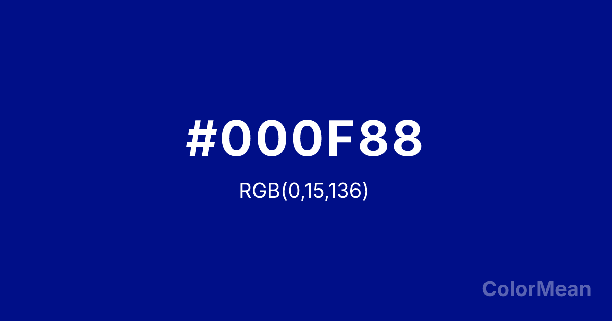 #000F88 RGB value is (0, 15, 136). The hex color red value is 0, green is 15, and blue is 136. Its HSL format shows a hue of 233°, saturation of 100 percent, and lightness of 27 percent. The CMYK process values are 100 percent, 89 percent, 0 percent, 47 percent.