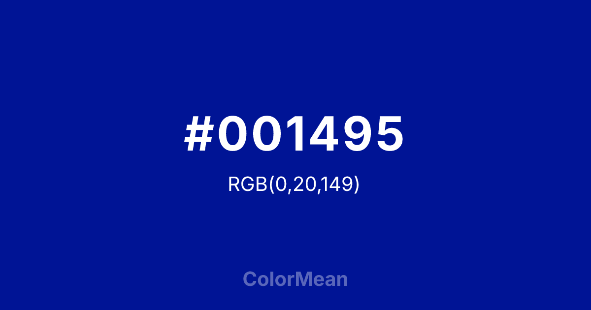 #001495 RGB value is (0, 20, 149). The hex color red value is 0, green is 20, and blue is 149. Its HSL format shows a hue of 232°, saturation of 100 percent, and lightness of 29 percent. The CMYK process values are 100 percent, 87 percent, 0 percent, 42 percent.