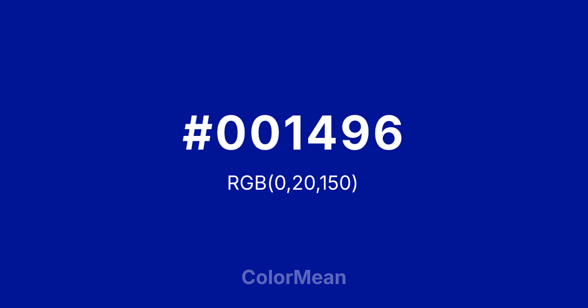 #001496 RGB value is (0, 20, 150). The hex color red value is 0, green is 20, and blue is 150. Its HSL format shows a hue of 232°, saturation of 100 percent, and lightness of 29 percent. The CMYK process values are 100 percent, 87 percent, 0 percent, 41 percent.