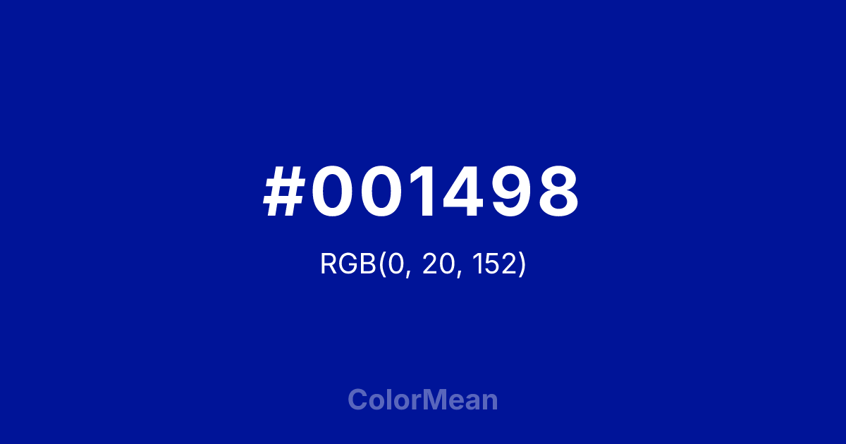 #001498 RGB value is (0, 20, 152). The hex color red value is 0, green is 20, and blue is 152. Its HSL format shows a hue of 232°, saturation of 100 percent, and lightness of 30 percent. The CMYK process values are 100 percent, 87 percent, 0 percent, 40 percent.