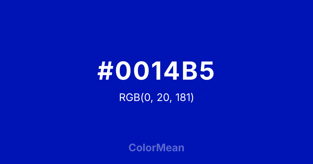#0014B5 RGB value is (0, 20, 181). The hex color red value is 0, green is 20, and blue is 181. Its HSL format shows a hue of 233°, saturation of 100 percent, and lightness of 35 percent. The CMYK process values are 100 percent, 89 percent, 0 percent, 29 percent.