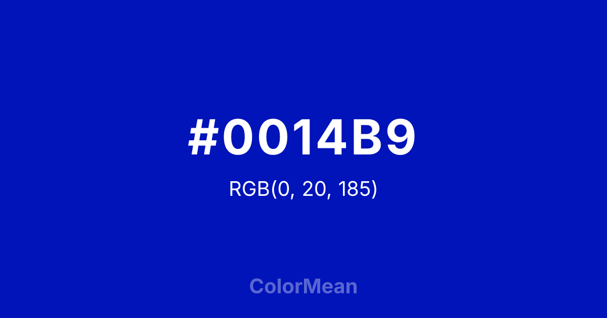 #0014B9 RGB value is (0, 20, 185). The hex color red value is 0, green is 20, and blue is 185. Its HSL format shows a hue of 234°, saturation of 100 percent, and lightness of 36 percent. The CMYK process values are 100 percent, 89 percent, 0 percent, 27 percent.