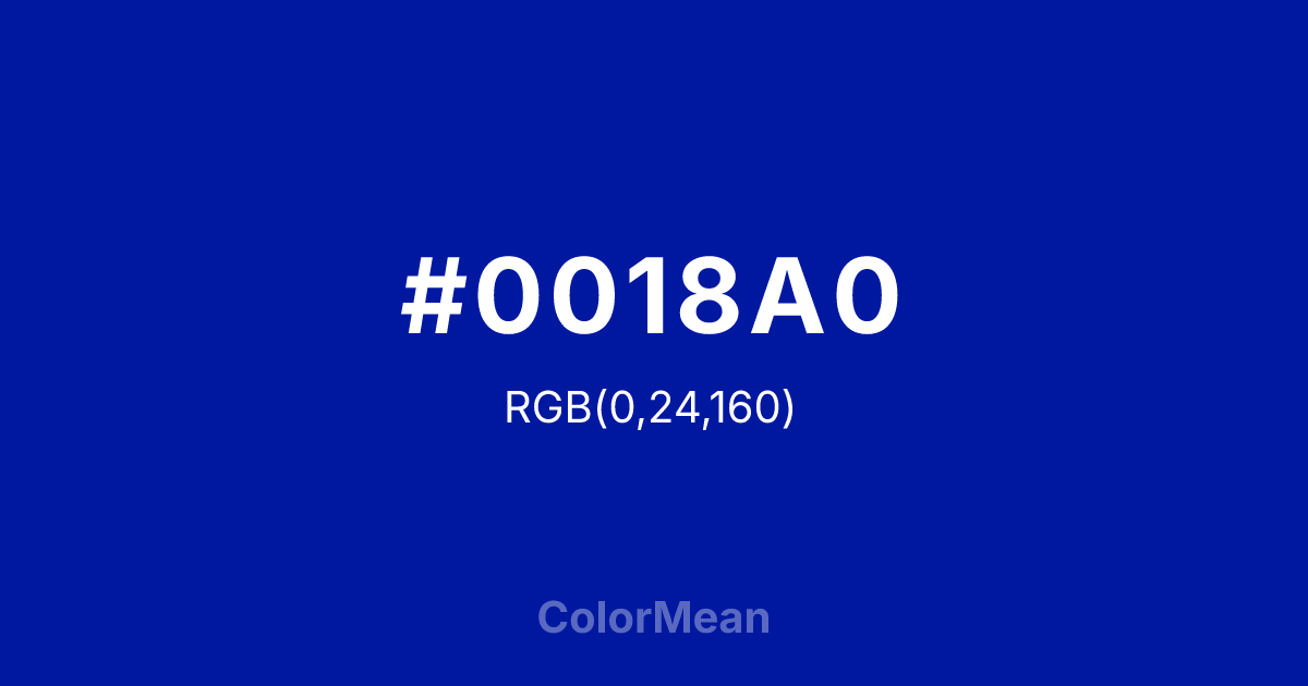 #0018A0 RGB value is (0, 24, 160). The hex color red value is 0, green is 24, and blue is 160. Its HSL format shows a hue of 231°, saturation of 100 percent, and lightness of 31 percent. The CMYK process values are 100 percent, 85 percent, 0 percent, 37 percent.