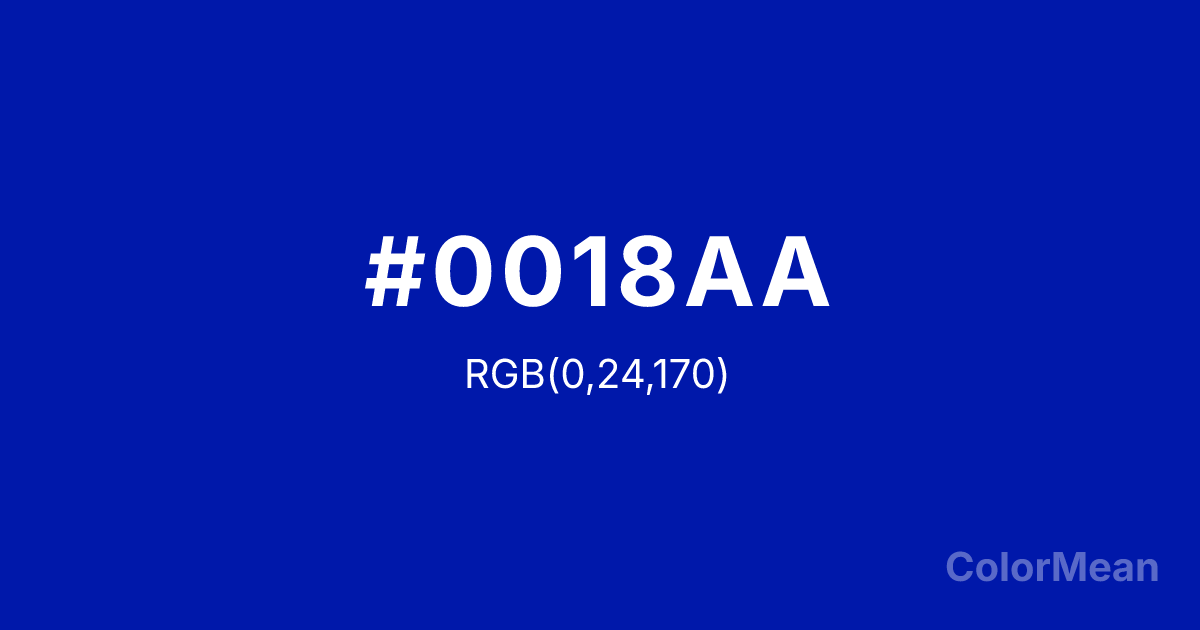 #0018AA RGB value is (0, 24, 170). The hex color red value is 0, green is 24, and blue is 170. Its HSL format shows a hue of 232°, saturation of 100 percent, and lightness of 33 percent. The CMYK process values are 100 percent, 86 percent, 0 percent, 33 percent.