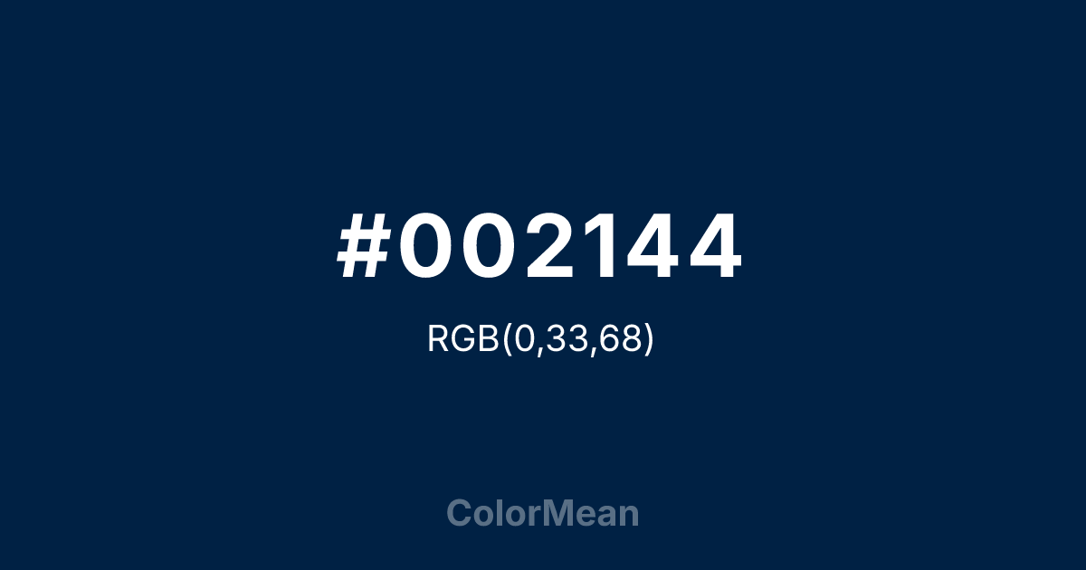 #002144 RGB value is (0, 33, 68). The hex color red value is 0, green is 33, and blue is 68. Its HSL format shows a hue of 211°, saturation of 100 percent, and lightness of 13 percent. The CMYK process values are 100 percent, 51 percent, 0 percent, 73 percent.