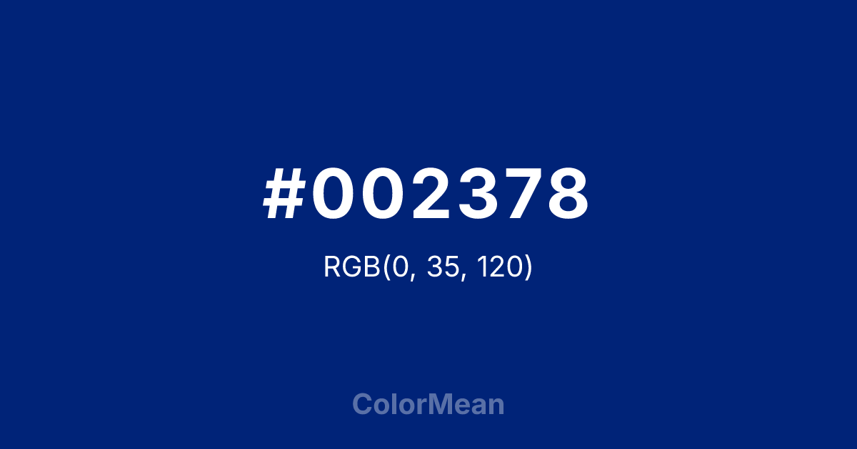 #002378 RGB value is (0, 35, 120). The hex color red value is 0, green is 35, and blue is 120. Its HSL format shows a hue of 223°, saturation of 100 percent, and lightness of 24 percent. The CMYK process values are 100 percent, 71 percent, 0 percent, 53 percent.