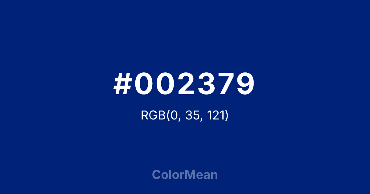 #002379 RGB value is (0, 35, 121). The hex color red value is 0, green is 35, and blue is 121. Its HSL format shows a hue of 223°, saturation of 100 percent, and lightness of 24 percent. The CMYK process values are 100 percent, 71 percent, 0 percent, 53 percent.