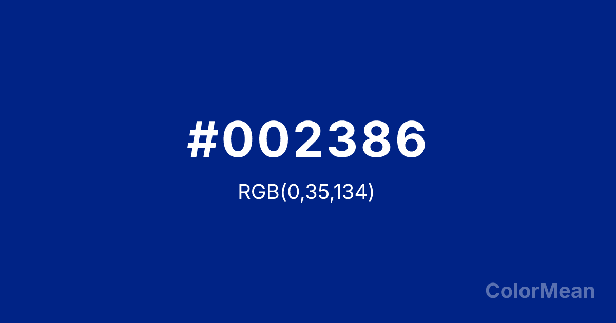 #002386 RGB value is (0, 35, 134). The hex color red value is 0, green is 35, and blue is 134. Its HSL format shows a hue of 224°, saturation of 100 percent, and lightness of 26 percent. The CMYK process values are 100 percent, 74 percent, 0 percent, 47 percent.