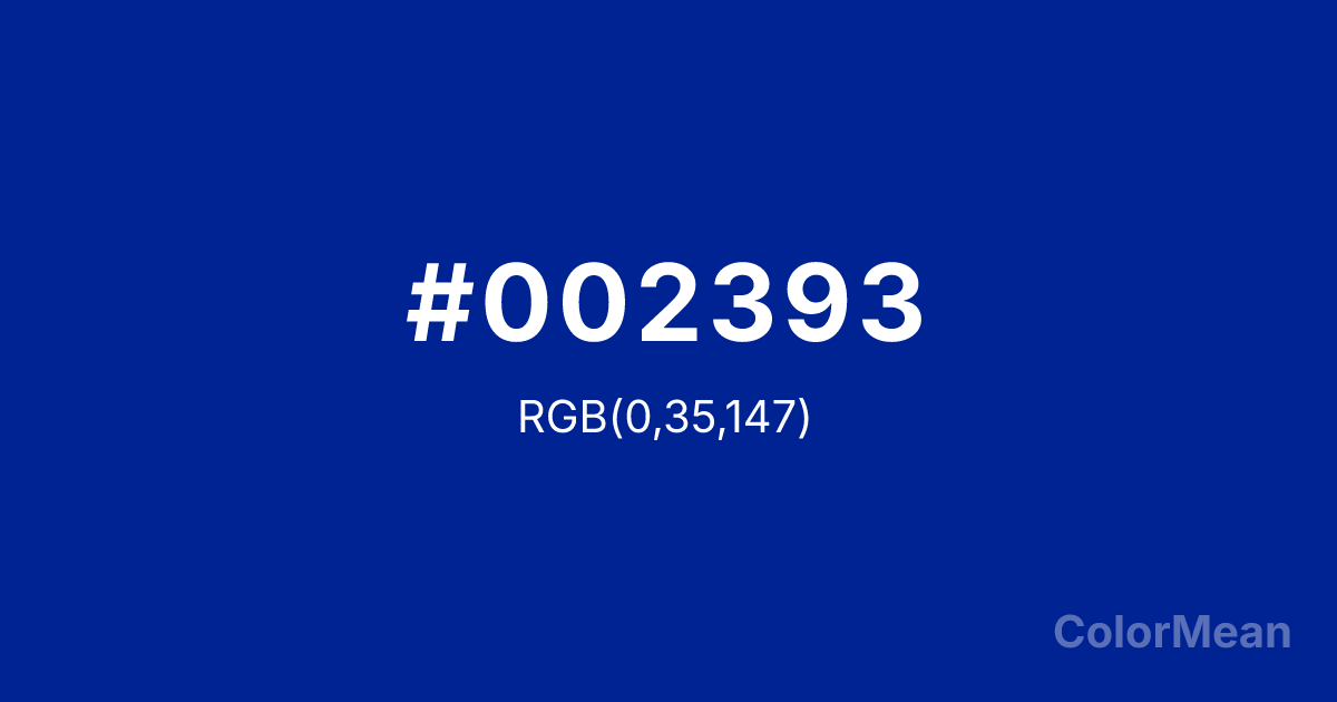 #002393 RGB value is (0, 35, 147). The hex color red value is 0, green is 35, and blue is 147. Its HSL format shows a hue of 226°, saturation of 100 percent, and lightness of 29 percent. The CMYK process values are 100 percent, 76 percent, 0 percent, 42 percent.