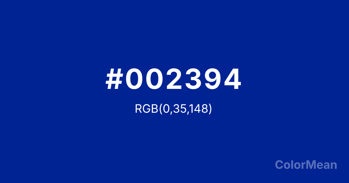 #002394 RGB value is (0, 35, 148). The hex color red value is 0, green is 35, and blue is 148. Its HSL format shows a hue of 226°, saturation of 100 percent, and lightness of 29 percent. The CMYK process values are 100 percent, 76 percent, 0 percent, 42 percent.