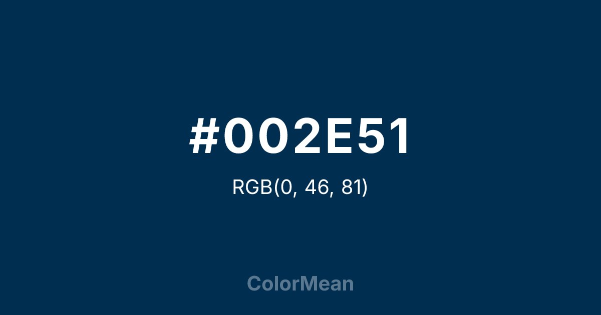 #002E51 RGB value is (0, 46, 81). The hex color red value is 0, green is 46, and blue is 81. Its HSL format shows a hue of 206°, saturation of 100 percent, and lightness of 16 percent. The CMYK process values are 100 percent, 43 percent, 0 percent, 68 percent.