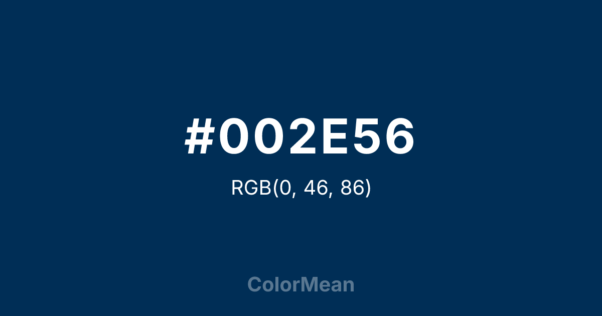 #002E56 RGB value is (0, 46, 86). The hex color red value is 0, green is 46, and blue is 86. Its HSL format shows a hue of 208°, saturation of 100 percent, and lightness of 17 percent. The CMYK process values are 100 percent, 47 percent, 0 percent, 66 percent.