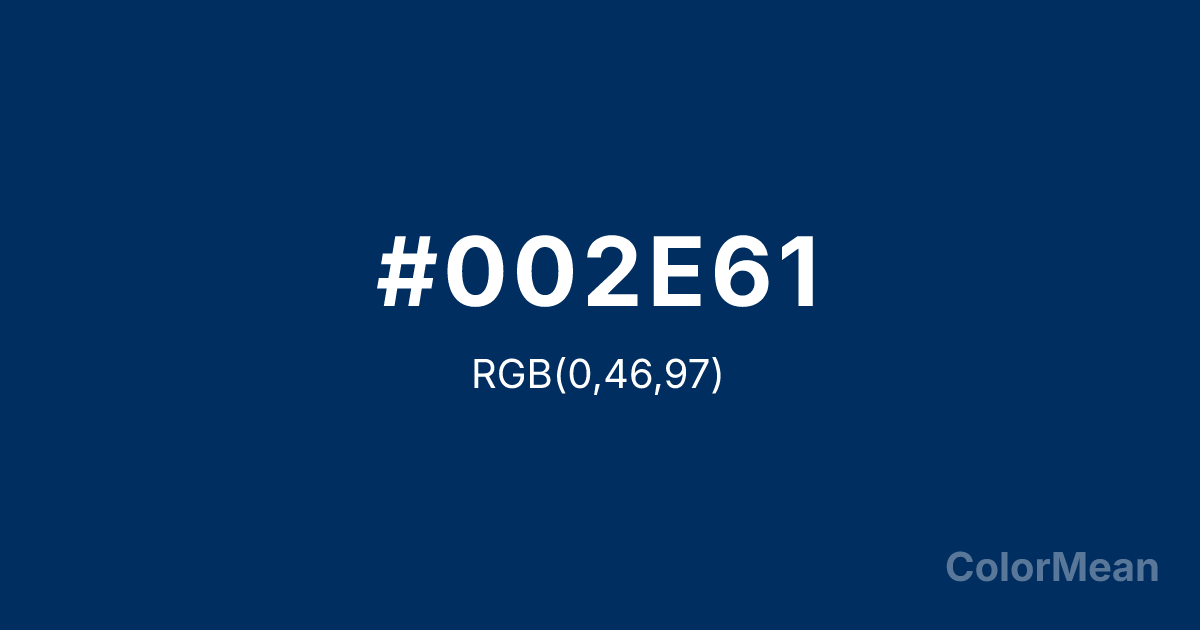 #002E61 RGB value is (0, 46, 97). The hex color red value is 0, green is 46, and blue is 97. Its HSL format shows a hue of 212°, saturation of 100 percent, and lightness of 19 percent. The CMYK process values are 100 percent, 53 percent, 0 percent, 62 percent.