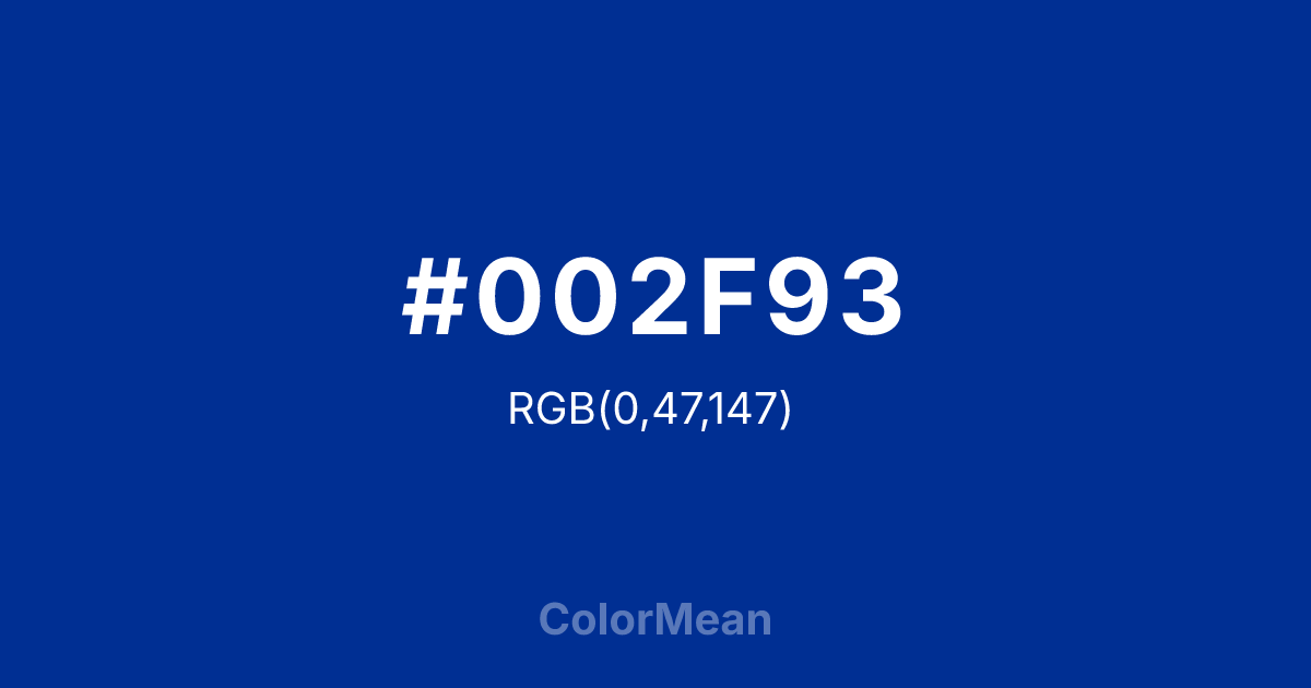 #002F93 RGB value is (0, 47, 147). The hex color red value is 0, green is 47, and blue is 147. Its HSL format shows a hue of 221°, saturation of 100 percent, and lightness of 29 percent. The CMYK process values are 100 percent, 68 percent, 0 percent, 42 percent.