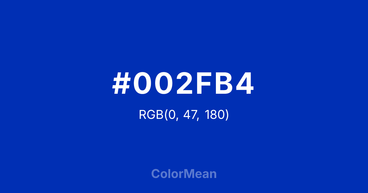 #002FB4 RGB value is (0, 47, 180). The hex color red value is 0, green is 47, and blue is 180. Its HSL format shows a hue of 224°, saturation of 100 percent, and lightness of 35 percent. The CMYK process values are 100 percent, 74 percent, 0 percent, 29 percent.