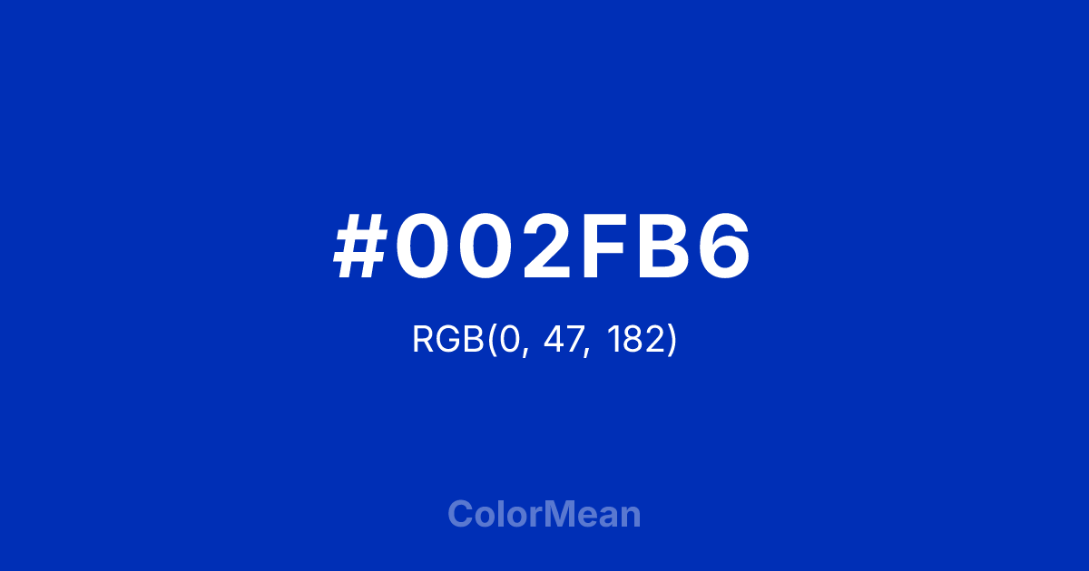 #002FB6 RGB value is (0, 47, 182). The hex color red value is 0, green is 47, and blue is 182. Its HSL format shows a hue of 225°, saturation of 100 percent, and lightness of 36 percent. The CMYK process values are 100 percent, 74 percent, 0 percent, 29 percent.