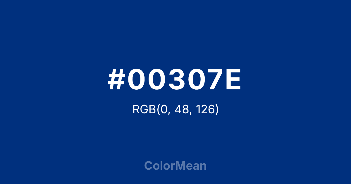 #00307E RGB value is (0, 48, 126). The hex color red value is 0, green is 48, and blue is 126. Its HSL format shows a hue of 217°, saturation of 100 percent, and lightness of 25 percent. The CMYK process values are 100 percent, 62 percent, 0 percent, 51 percent.