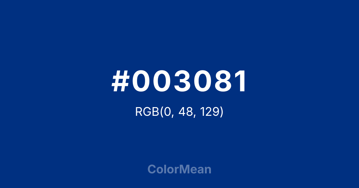 #003081 RGB value is (0, 48, 129). The hex color red value is 0, green is 48, and blue is 129. Its HSL format shows a hue of 218°, saturation of 100 percent, and lightness of 25 percent. The CMYK process values are 100 percent, 63 percent, 0 percent, 49 percent.