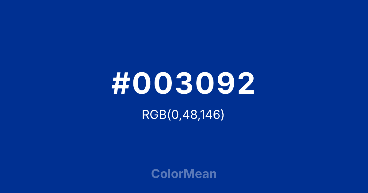 #003092 RGB value is (0, 48, 146). The hex color red value is 0, green is 48, and blue is 146. Its HSL format shows a hue of 220°, saturation of 100 percent, and lightness of 29 percent. The CMYK process values are 100 percent, 67 percent, 0 percent, 43 percent.