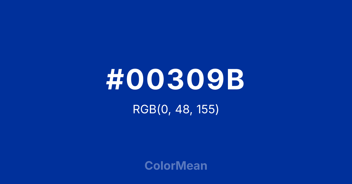 #00309B RGB value is (0, 48, 155). The hex color red value is 0, green is 48, and blue is 155. Its HSL format shows a hue of 221°, saturation of 100 percent, and lightness of 30 percent. The CMYK process values are 100 percent, 69 percent, 0 percent, 39 percent.