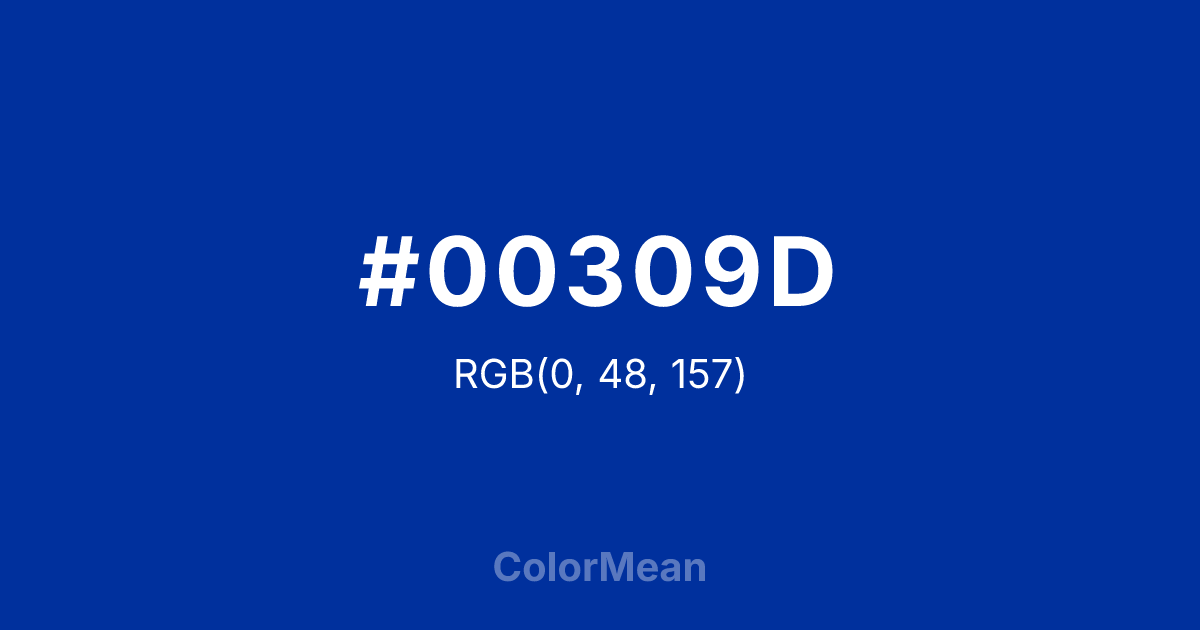 #00309D RGB value is (0, 48, 157). The hex color red value is 0, green is 48, and blue is 157. Its HSL format shows a hue of 222°, saturation of 100 percent, and lightness of 31 percent. The CMYK process values are 100 percent, 69 percent, 0 percent, 38 percent.