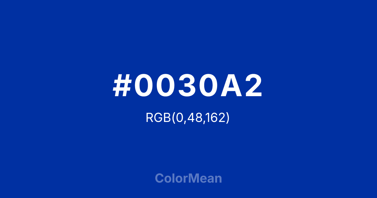 #0030A2 RGB value is (0, 48, 162). The hex color red value is 0, green is 48, and blue is 162. Its HSL format shows a hue of 222°, saturation of 100 percent, and lightness of 32 percent. The CMYK process values are 100 percent, 70 percent, 0 percent, 36 percent.