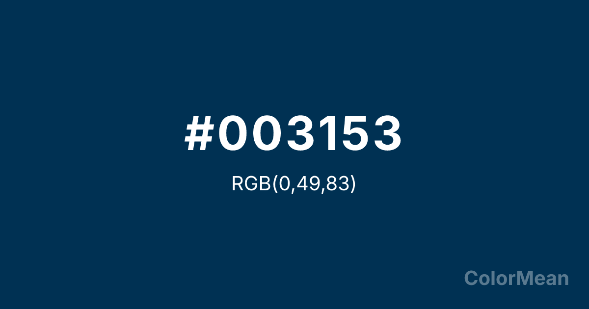 Prussian Blue (#003153) RGB value is (0, 49, 83). The hex color red value is 0, green is 49, and blue is 83. Its HSL format shows a hue of 205°, saturation of 100 percent, and lightness of 16 percent. The CMYK process values are 100 percent, 41 percent, 0 percent, 67 percent.