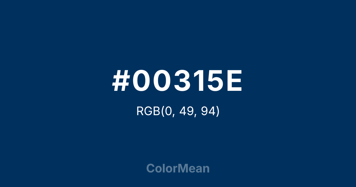 #00315E RGB value is (0, 49, 94). The hex color red value is 0, green is 49, and blue is 94. Its HSL format shows a hue of 209°, saturation of 100 percent, and lightness of 18 percent. The CMYK process values are 100 percent, 48 percent, 0 percent, 63 percent.