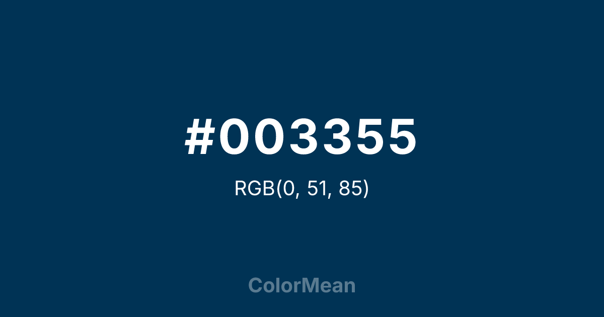 #003355 RGB value is (0, 51, 85). The hex color red value is 0, green is 51, and blue is 85. Its HSL format shows a hue of 204°, saturation of 100 percent, and lightness of 17 percent. The CMYK process values are 100 percent, 40 percent, 0 percent, 67 percent.