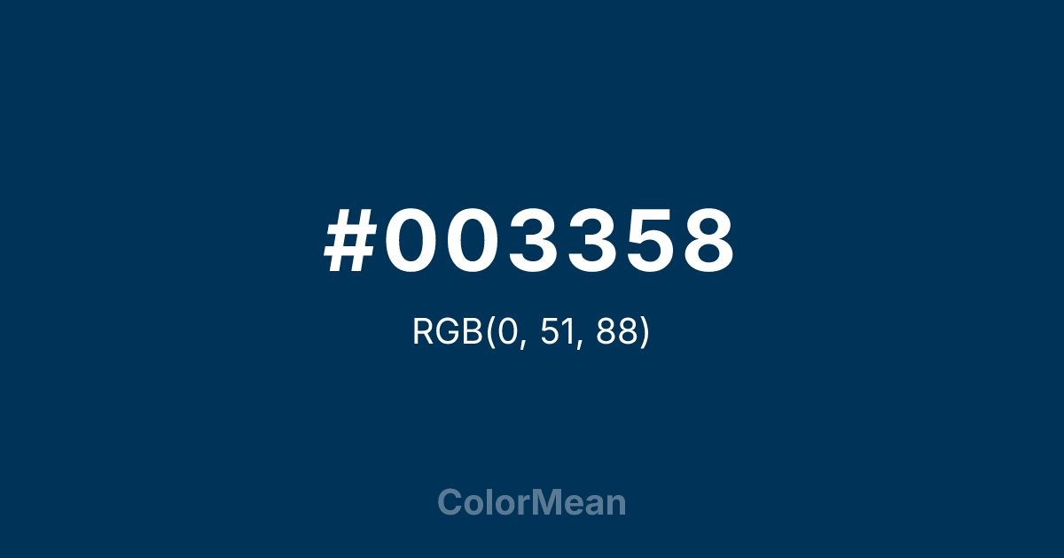 #003358 RGB value is (0, 51, 88). The hex color red value is 0, green is 51, and blue is 88. Its HSL format shows a hue of 205°, saturation of 100 percent, and lightness of 17 percent. The CMYK process values are 100 percent, 42 percent, 0 percent, 65 percent.