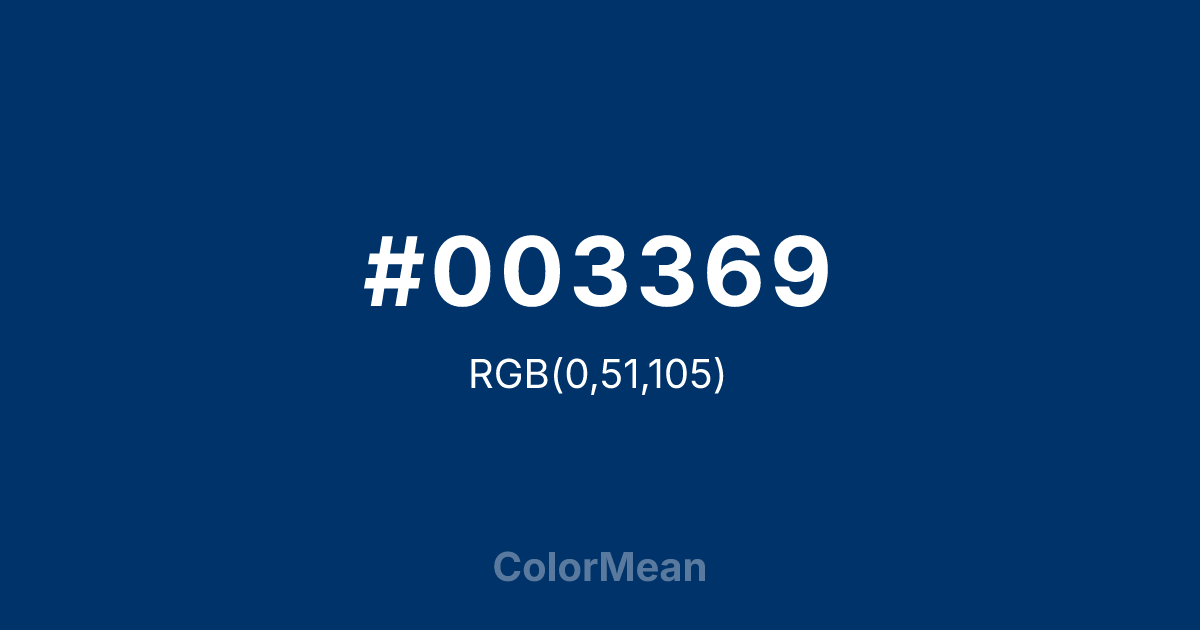#003369 RGB value is (0, 51, 105). The hex color red value is 0, green is 51, and blue is 105. Its HSL format shows a hue of 211°, saturation of 100 percent, and lightness of 21 percent. The CMYK process values are 100 percent, 51 percent, 0 percent, 59 percent.