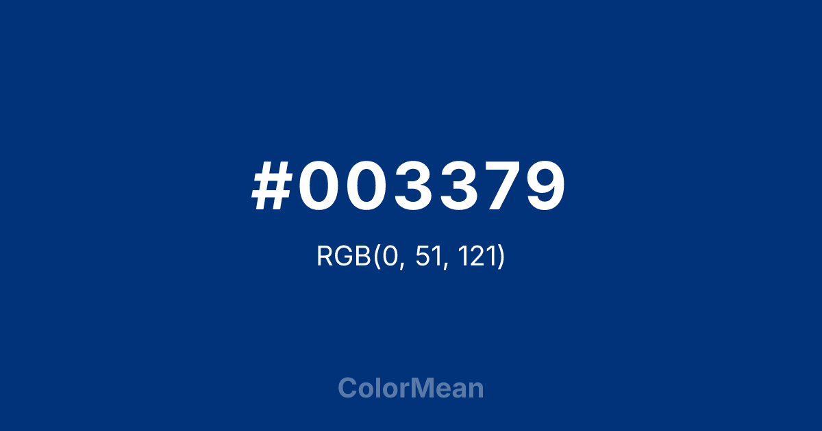 #003379 RGB value is (0, 51, 121). The hex color red value is 0, green is 51, and blue is 121. Its HSL format shows a hue of 215°, saturation of 100 percent, and lightness of 24 percent. The CMYK process values are 100 percent, 58 percent, 0 percent, 53 percent.