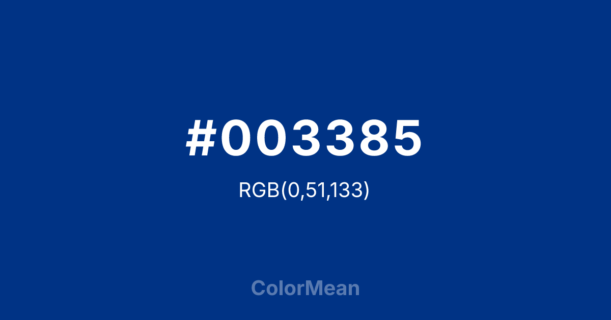 #003385 RGB value is (0, 51, 133). The hex color red value is 0, green is 51, and blue is 133. Its HSL format shows a hue of 217°, saturation of 100 percent, and lightness of 26 percent. The CMYK process values are 100 percent, 62 percent, 0 percent, 48 percent.