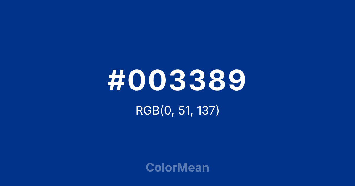 #003389 RGB value is (0, 51, 137). The hex color red value is 0, green is 51, and blue is 137. Its HSL format shows a hue of 218°, saturation of 100 percent, and lightness of 27 percent. The CMYK process values are 100 percent, 63 percent, 0 percent, 46 percent.