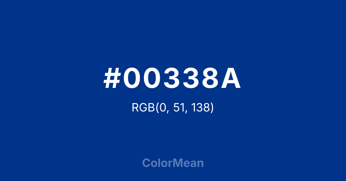 #00338A RGB value is (0, 51, 138). The hex color red value is 0, green is 51, and blue is 138. Its HSL format shows a hue of 218°, saturation of 100 percent, and lightness of 27 percent. The CMYK process values are 100 percent, 63 percent, 0 percent, 46 percent.