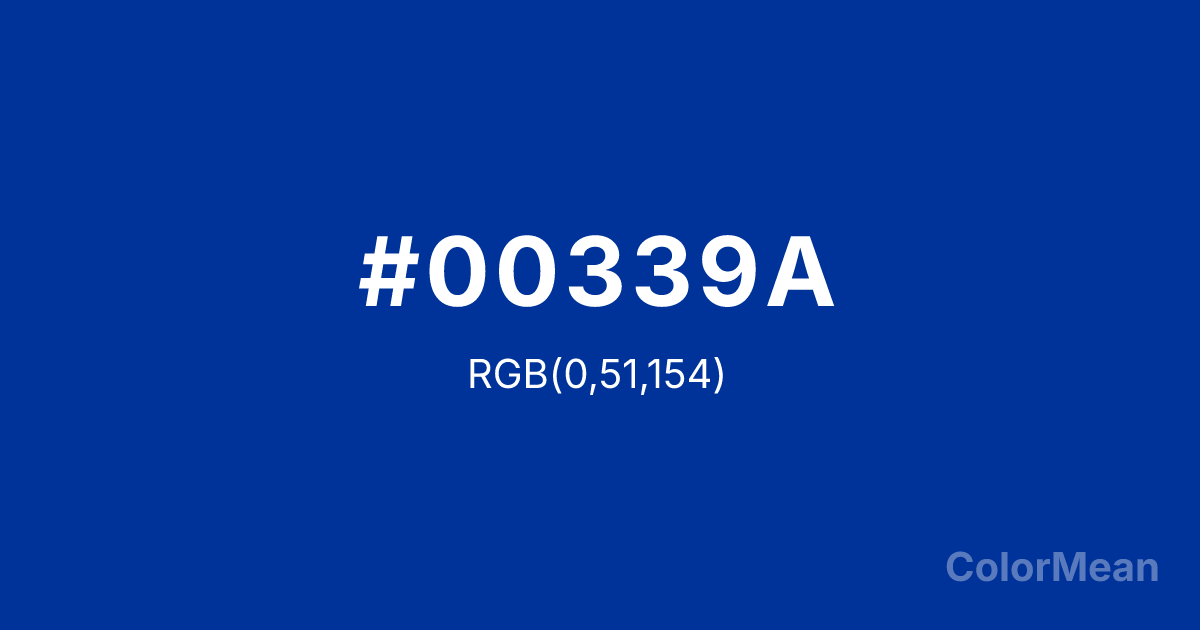 #00339A RGB value is (0, 51, 154). The hex color red value is 0, green is 51, and blue is 154. Its HSL format shows a hue of 220°, saturation of 100 percent, and lightness of 30 percent. The CMYK process values are 100 percent, 67 percent, 0 percent, 40 percent.
