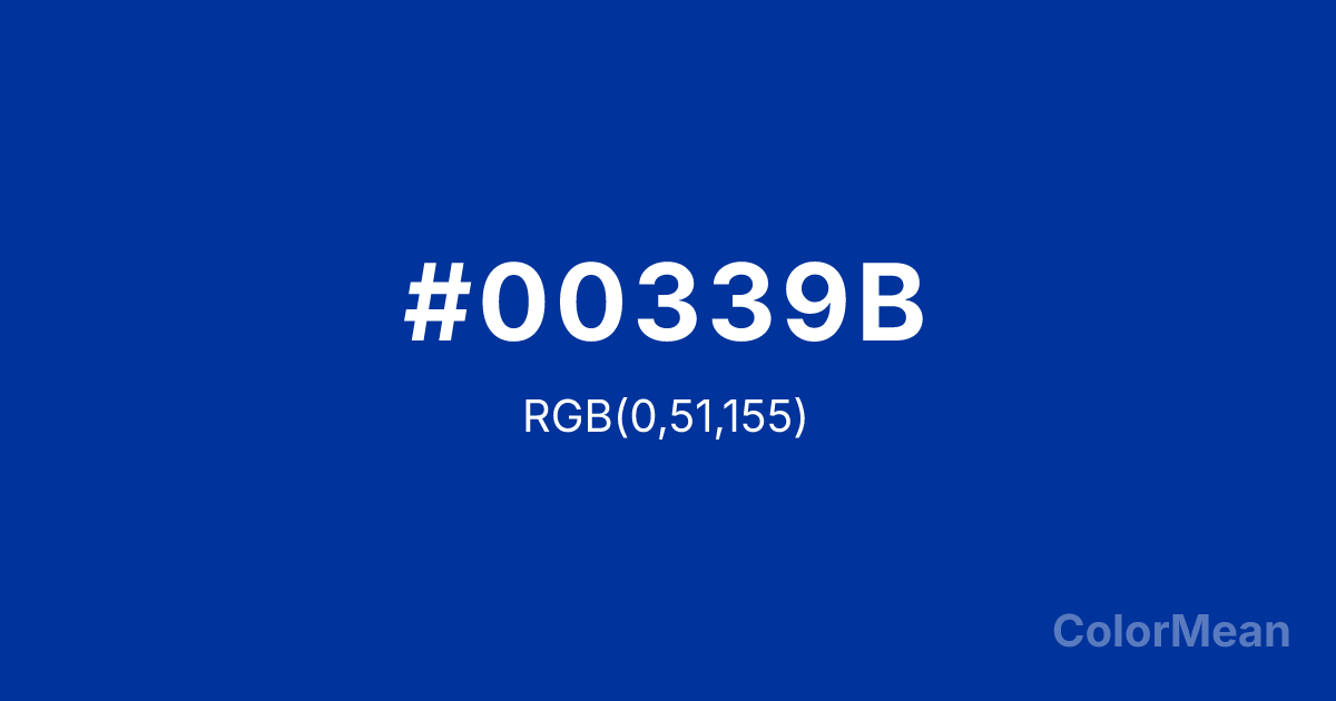 #00339B RGB value is (0, 51, 155). The hex color red value is 0, green is 51, and blue is 155. Its HSL format shows a hue of 220°, saturation of 100 percent, and lightness of 30 percent. The CMYK process values are 100 percent, 67 percent, 0 percent, 39 percent.