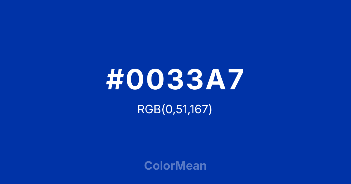 #0033A7 RGB value is (0, 51, 167). The hex color red value is 0, green is 51, and blue is 167. Its HSL format shows a hue of 222°, saturation of 100 percent, and lightness of 33 percent. The CMYK process values are 100 percent, 69 percent, 0 percent, 35 percent.