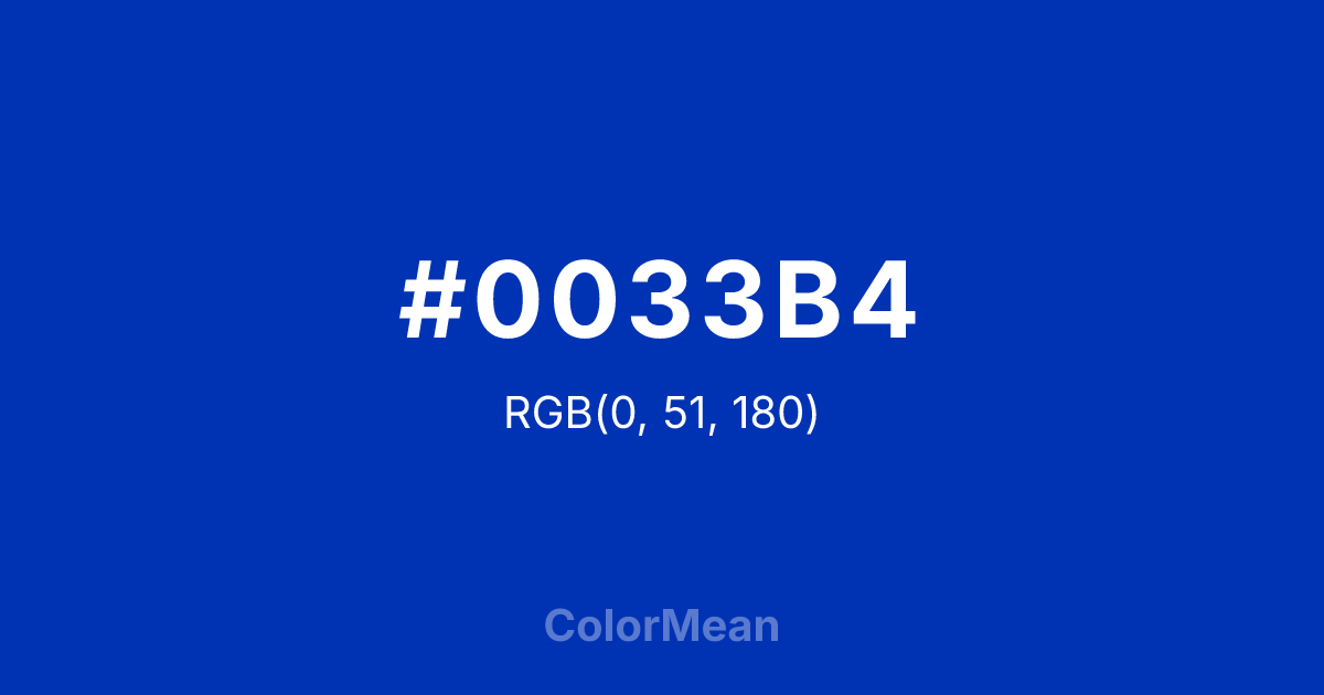 #0033B4 RGB value is (0, 51, 180). The hex color red value is 0, green is 51, and blue is 180. Its HSL format shows a hue of 223°, saturation of 100 percent, and lightness of 35 percent. The CMYK process values are 100 percent, 72 percent, 0 percent, 29 percent.