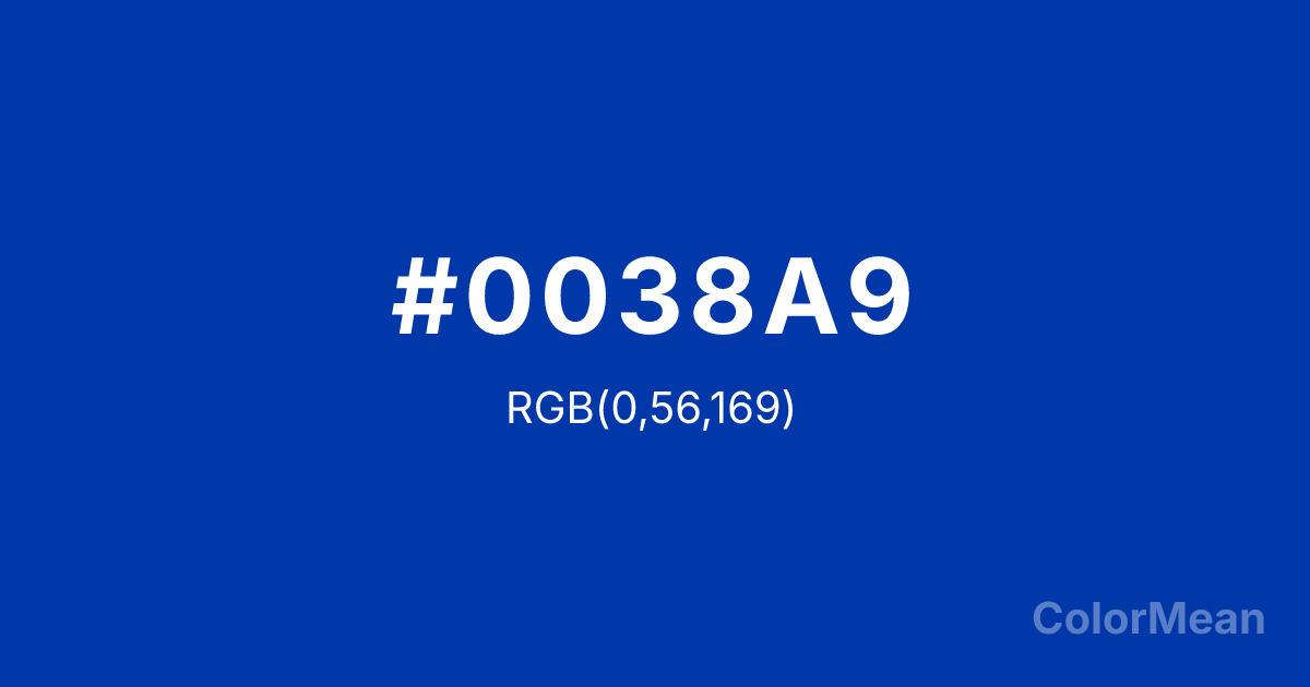 #0038A9 RGB value is (0, 56, 169). The hex color red value is 0, green is 56, and blue is 169. Its HSL format shows a hue of 220°, saturation of 100 percent, and lightness of 33 percent. The CMYK process values are 100 percent, 67 percent, 0 percent, 34 percent.