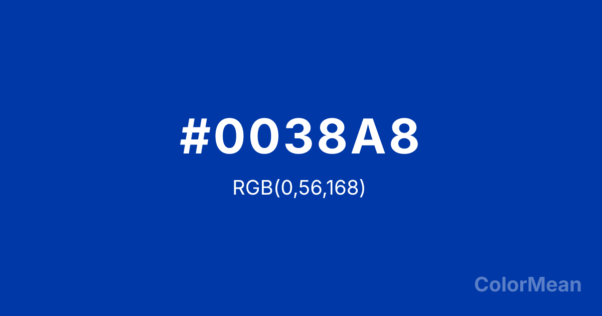 Royal Azure (#0038A8) RGB value is (0, 56, 168). The hex color red value is 0, green is 56, and blue is 168. Its HSL format shows a hue of 220°, saturation of 100 percent, and lightness of 33 percent. The CMYK process values are 100 percent, 67 percent, 0 percent, 34 percent.