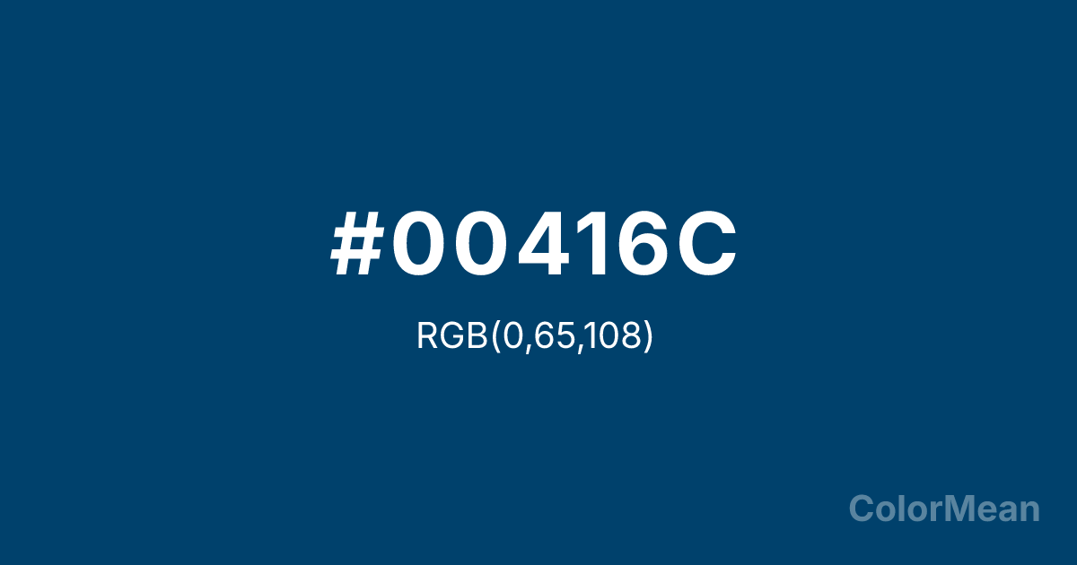 #00416C RGB value is (0, 65, 108). The hex color red value is 0, green is 65, and blue is 108. Its HSL format shows a hue of 204°, saturation of 100 percent, and lightness of 21 percent. The CMYK process values are 100 percent, 40 percent, 0 percent, 58 percent.