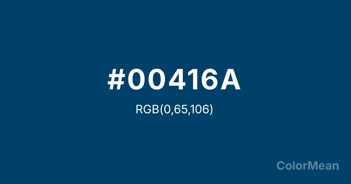 Dark Imperial Blue (#00416A) RGB value is (0, 65, 106). The hex color red value is 0, green is 65, and blue is 106. Its HSL format shows a hue of 203°, saturation of 100 percent, and lightness of 21 percent. The CMYK process values are 100 percent, 39 percent, 0 percent, 58 percent.