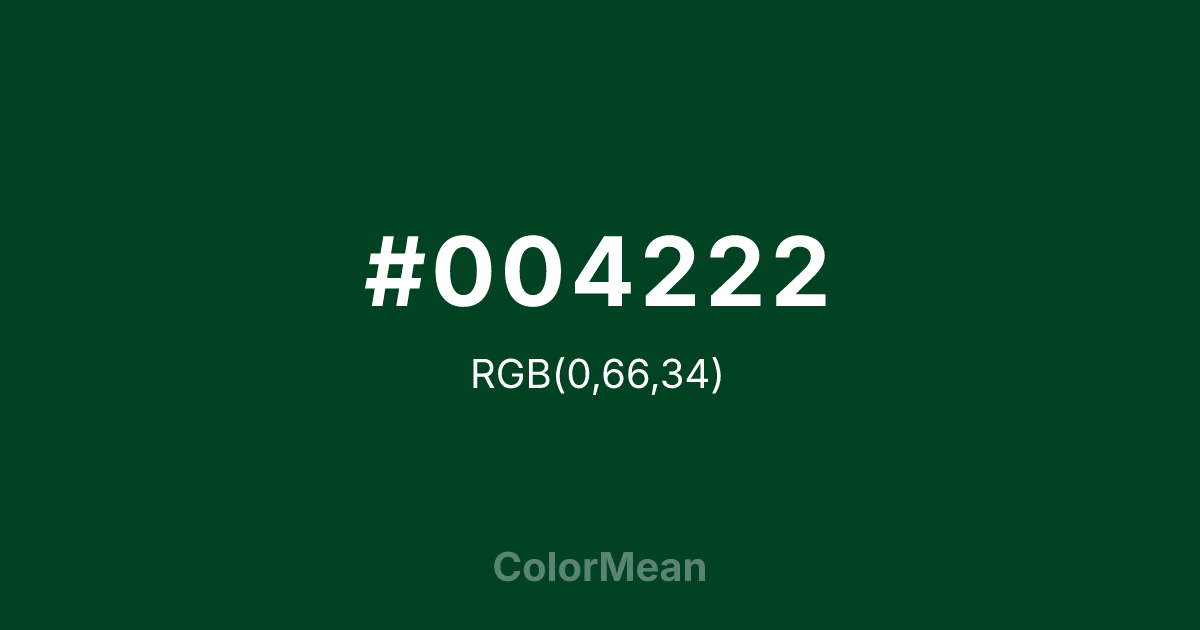 #004222 RGB value is (0, 66, 34). The hex color red value is 0, green is 66, and blue is 34. Its HSL format shows a hue of 151°, saturation of 100 percent, and lightness of 13 percent. The CMYK process values are 100 percent, 0 percent, 48 percent, 74 percent.